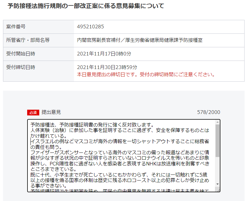 予防接種証明で生活範囲を狭め、国民の自由意思を無視する法律は民主主義を捨てる意味を持つ。事が起きてから動く国家がこのことばかりは起こってもないに等しい状況にもかからわず随分腰が軽いことに違和感しかない。