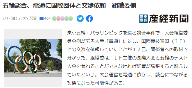 ただ、IFが組織委の運営能力を疑問視していたため、組織委上層部は同年、本来は組織委が担うIFとの交渉を電通に「お願いしたい」と依頼。IFの協力を得られず組織委が自前で運営するテスト大会が増えれば経費が膨らむ可能性が高く、上層部は「これ以上経費が増えないようにしてほしい」とも要請した。