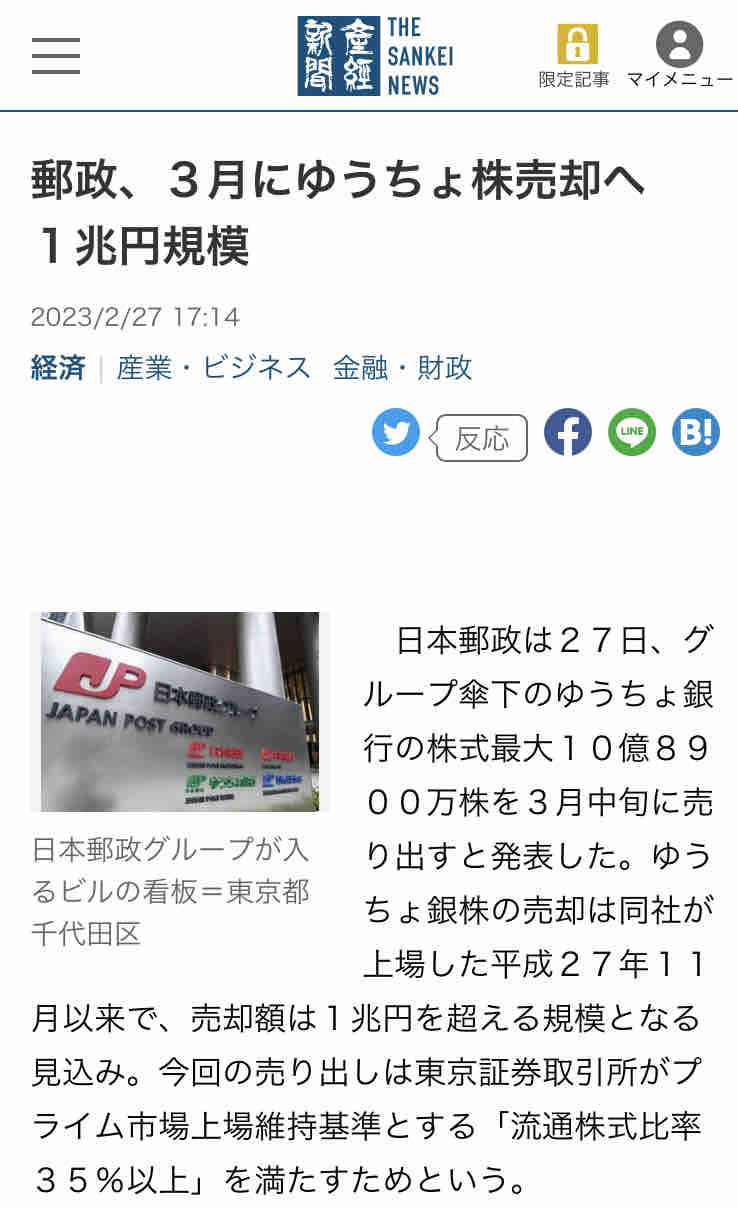 売り出し価格は未定。売り出し株数は約9億7500万株で、市場動向次第で最大10億8900万株まで増える可能性があるという。日本郵政は現在、ゆうちょ銀株の約89%を保有する。このため、ゆうちょ銀は東証がガバナンス(企業統治)の観点から定めた上場維持基準に適合していない状態だ。