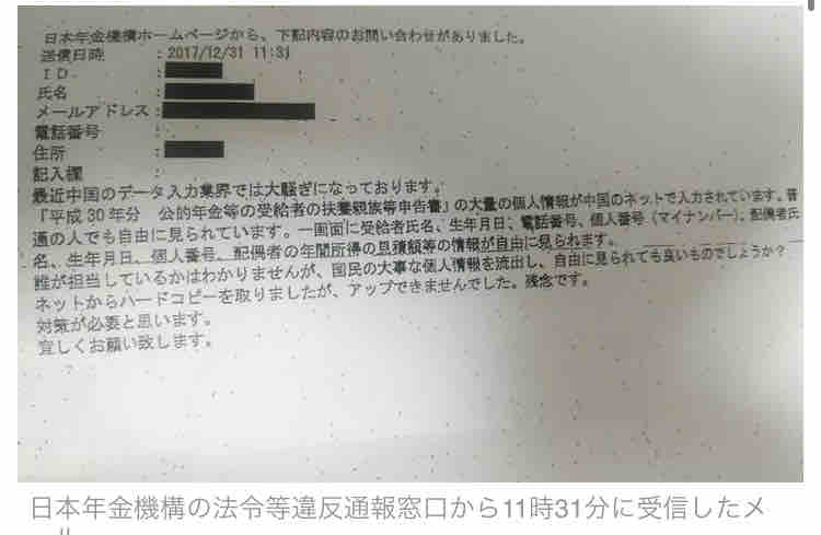 「これは日本年金機構の法令等違反通報窓口にどなたから来たメールの実物です」
