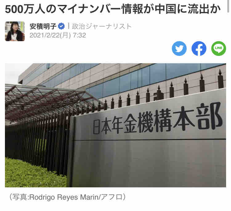 さて、日本年金機構から500万人の年金受給者の個人データの入力業務を委託された「SAY企画」(現在は廃業)が、禁止されている再委託を中国業者に行っていたことが発覚したのは2018年3月のことだった。6万7000人の受給者が所得税控除が受けられず、本来より少ない年金しか受領できなかったことがきっかけだ。しかも入力ミスは86万か所もあり、極めてずさんな仕事だった。ミスの多くは日本での作業から発生したと言われているが、ここでとんでもない問題が発覚した。個人情報漏洩だ。