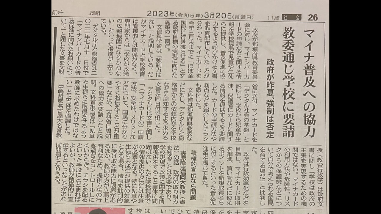 文部科学省は「強制力はない」と説明している。だがマイナカードと学校教育は直接的には関係がなく、専門家からは「学校が政策の広報機関になりかねない」といった指摘が上がっている。