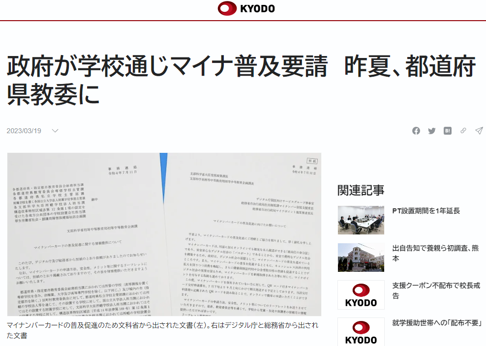 政府が都道府県教育委員会に対し、マイナンバーカードの申請などに関する情報を学校現場で児童や生徒らに提供し、普及促進に協力するよう呼びかける文書を昨夏配布していたことが19日分かった。マイナカードを今年3月末までに「ほぼ全国民に行き渡らせる」とする政府目標の実現に向けた施策の一環だ。