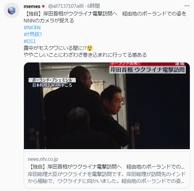 大手メディアに情報ダダ漏れで「ウクライナ電撃訪問」どころか『実況中継』される岸田総理。自身が議長を務めるG7広島サミットでいい顔したいため、「🇷🇺への制裁継続」や「🇺🇦への支援継続」という『日本国民に負担が増える内容』を体を張って… https://t.co/mbmr9ONSRA