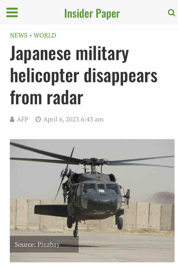 軍の広報担当者とメディアの報道によると、10 人が搭乗した日本軍のヘリコプターが木曜日、沖縄県南部の島の近くでレーダーから姿を消しました。航空機は午後4時30分(0730 GMT)頃に行方不明になり、陸上自衛隊が状況を評価して情報を収集するために急いでいたと、当局者は詳述せずに述べた。ヘリは熊本南部地域の陸軍支部に所属していた、と公共放送局NHKは述べた。