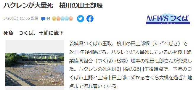 桜川を管理する茨城県土浦土木事務所河川整備課(土浦市中高津)によると、死んだのは推定で数千匹。県は、流れ下って河川に点在する死魚全てを回収することは困難だが、死魚が集中している箇所を中心に26日から回収を始めているとしている。