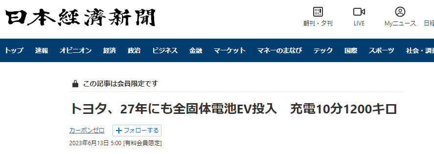 トヨタ 10分充電で1200km June 13, 2023 12:28 トヨタ自動車は2027年にも次世代電池の本命とされる「全固体電池」を搭載した電気自動車(EV)を投入する。10分以下の充電で約1200キロメートルを走行でき、航続距離は現在のEVの2.4倍に伸びる。 カテゴリなしの他の記事 < 前の記事次の記事 >