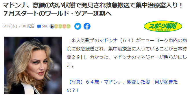 マネジャーのガイ・オセアリー氏は29日、自身のインスタグラムに「6月24日土曜日、マドンナは重篤な細菌感染症を発症し、ICUに数日間入院することになった」と記したメッセージを投稿。複数の米メディア報道によると、マドンナは24日に自宅で意識がない状態で発見され、救急搬送されたという。
