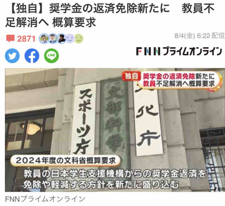 文部科学省は、2024年度の概算要求に、教員として就職した人の奨学金の返済を免除するなどの方針を新たに盛り込むことがFNNの取材でわかった。