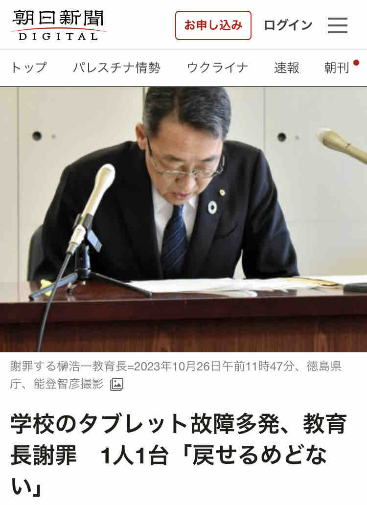 高校などに配備された「1人1台」のタブレット端末の故障が多発している問題で、徳島県教委の榊浩一教育長が26日、記者会見し、「生徒の学びの場に不自由をおかけしており深くおわびする」と謝罪した。故障機は全て中国の「ツーウェイ」社製で、約1万5千人の生徒に対し、3500台以上が故障で使えないと明らかにし、複数生徒で1台を利用するなど緊急措置でしのいでいるという。