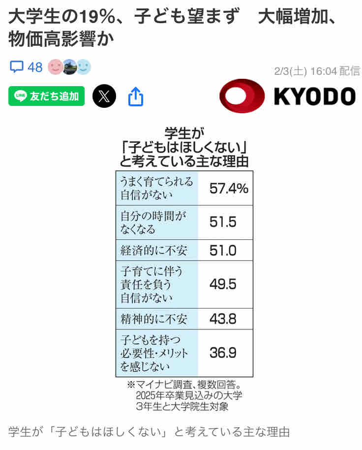 大学や大学院を2025年に卒業する見込みの学生のうち、5人に1人に相当する19.2%が「子どもはほしくない」と考えていることが、就職情報サイトを運営するマイナビ(東京)の調査で3日、分かった。24年卒の前回調査の13.1%から大幅に増加した。回答者は学生生活で物価高の影響を大きく受けた世代で、調査担当者は「経済面への不安が人生観に影響を与えている可能性がある」とした。
