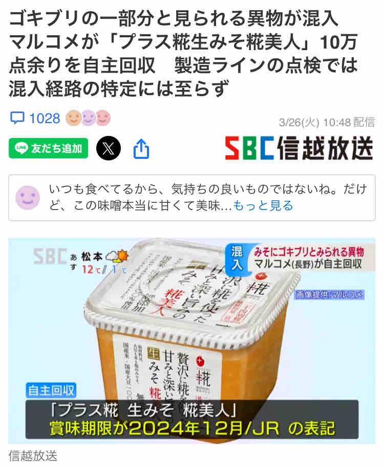 長野市に本社を置く「マルコメ」は、製造販売した味噌にゴキブリの一部分と見られる異物が混入していたとして自主回収を始めました。