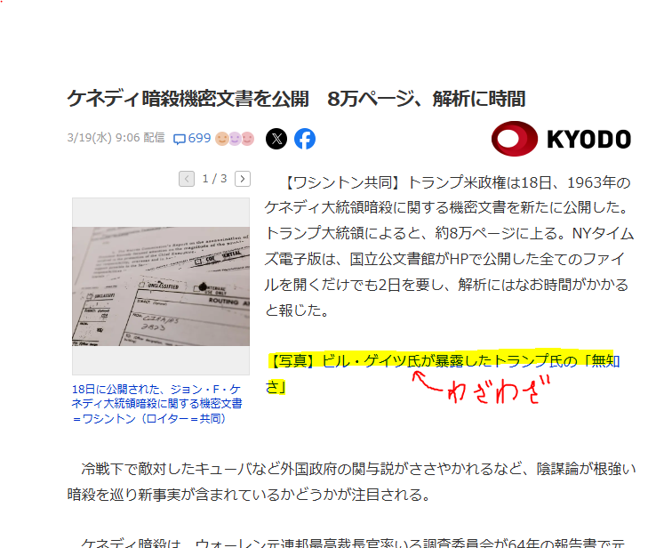【ワシントン共同】トランプ米政権は18日、1963年のケネディ大統領暗殺に関する機密文書を新たに公開した。トランプ大統領によると、約8万ページに上る。NYタイムズ電子版は、国立公文書館がHPで公開した全てのファイルを開くだけでも2日を要し、解析にはなお時間がかかると報じた。
