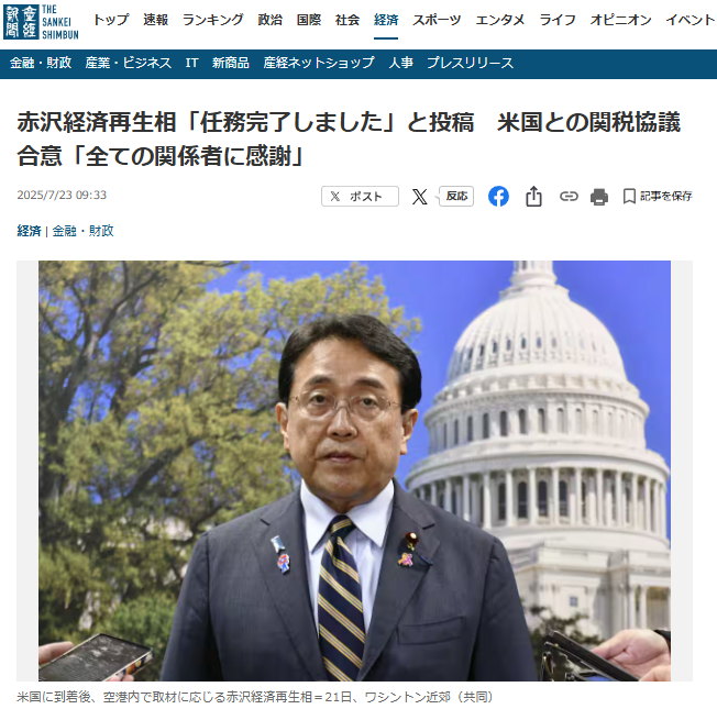 赤沢亮正経済再生担当相は23日、自らの交流サイト(SNS)で、米ホワイトハウスを