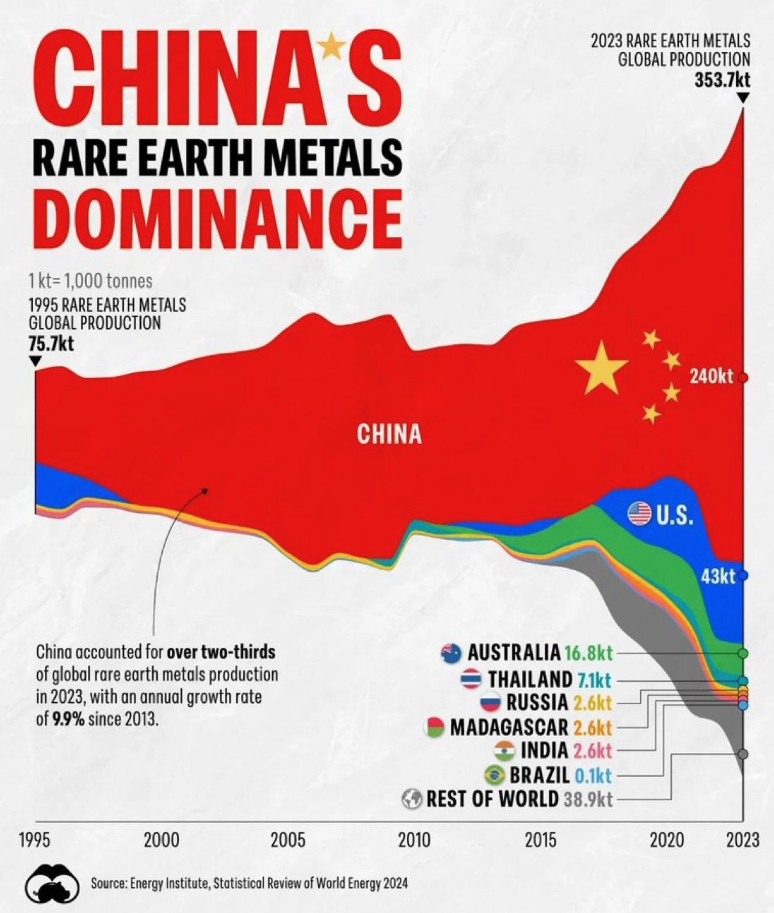 北京はレアアースの採掘の70%、加工の90%、永久磁石生産の93%を支配している。