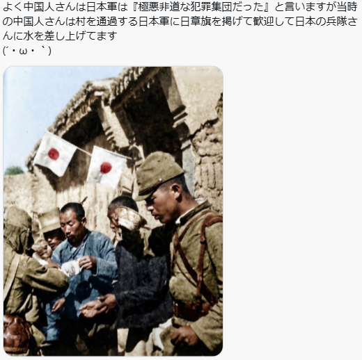 例えば当時日本軍により蒋介石軍が漢口から駆逐された事を聞きつけた中国人民衆がすぐに街に戻ってくる写真が実際にありますし、当時なにより日本軍は自分達の生活秩序を馬賊匪賊から守ってくれる治安維持軍というのが漢人の共通認識でした。