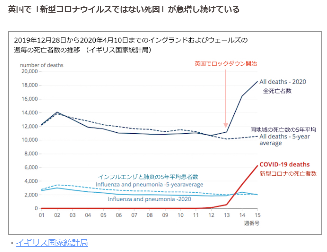 イングランドとウェールズは、1週間で 1万6,387人という記録的な死亡数となり、この時期の平均よりも 6,000人死亡数が多かった。このイギリス国家統計局の数値は、2005年に英国で記録が開始されて以来、最大の週別死者数だが、多くは新型コロナウイルスによって死亡したのではないことが示されており、これらの死亡者のうちの約半数だけが新型コロナウイルスに起因した死だった。