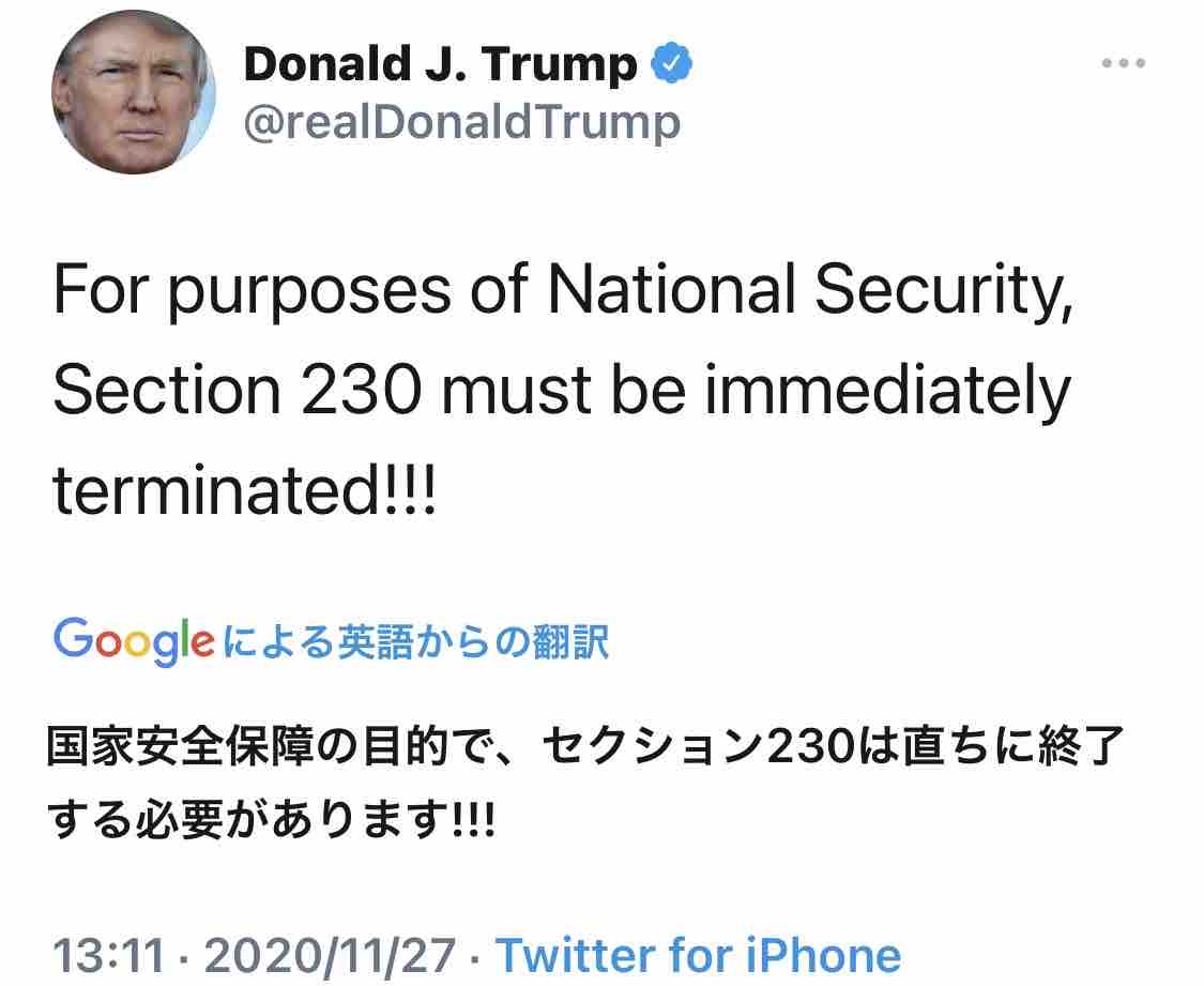 セクション230は、プラットフォームはそのプラットフォーム上のコンテンツのパブリッシャーとはみなさないというもの。大まかに言えば、プラットフォームは発言の場を提供しているだけなので、どのような発言があってもその発言に責任はないということだ。例えば米Facebookが2016年の大統領選でのフェイクニュース拡散の責任を法的に問われないのは、この条項のためだ。