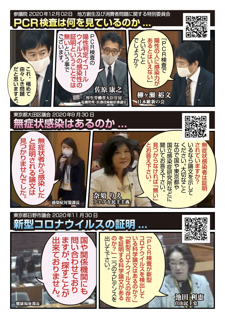 PCRの結果だけが独り歩きしている。ひたすらPCRの結果が、今回のウイルスを検出していることに間違いはないという思い込みがあるようだ。しかし、ウイルスは変異を続け、PCR検査には有効期限が存在する。しかも、病原体でない遺伝子を拾っているとすれば、医学的には無意味な検査となっているので、即刻にPCR検査をやめることが必要なはずである。